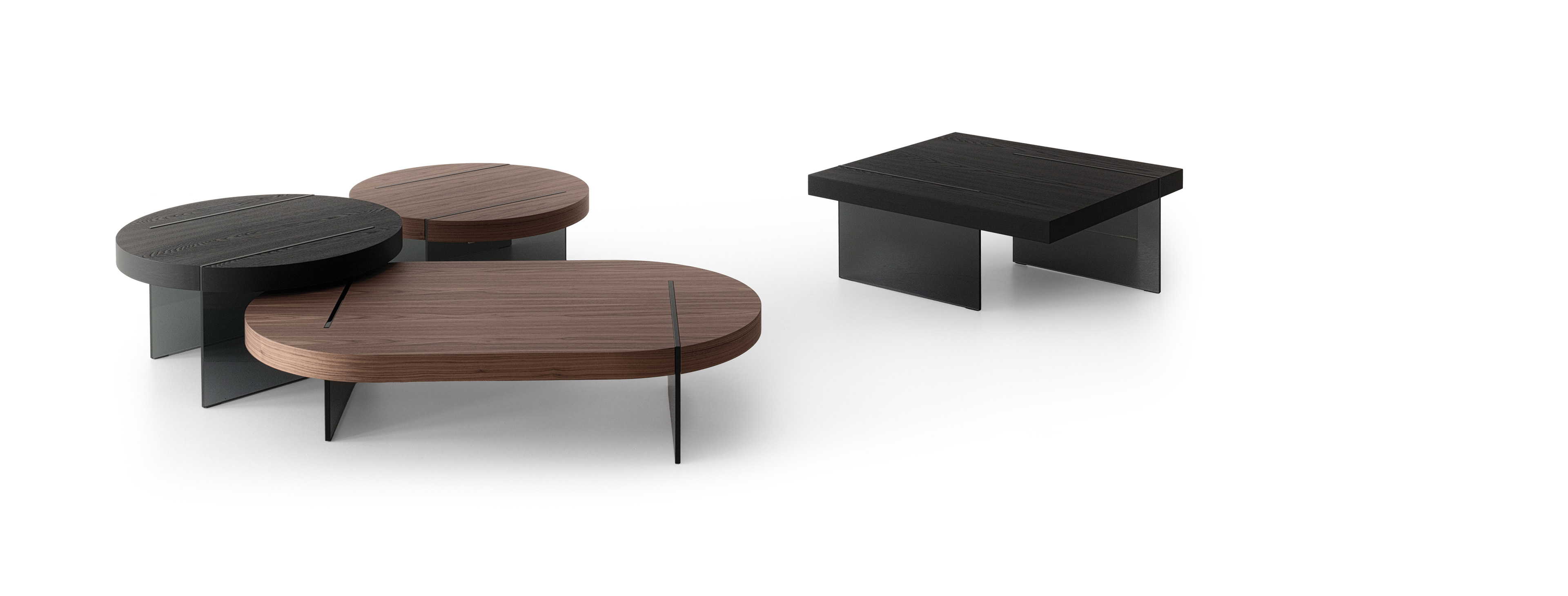 Byron coffee tables with veneered wood top in two finishes: Canaletto walnut wood and black ash. Glass feet available in two finishes: extra clear and smoked. Byron tavolini con top in legno impiallacciato con due finiture: Noce Canaletto e frassino nero. Piedi in vetro disponibile in due finiture: extra chiaro e fumè.