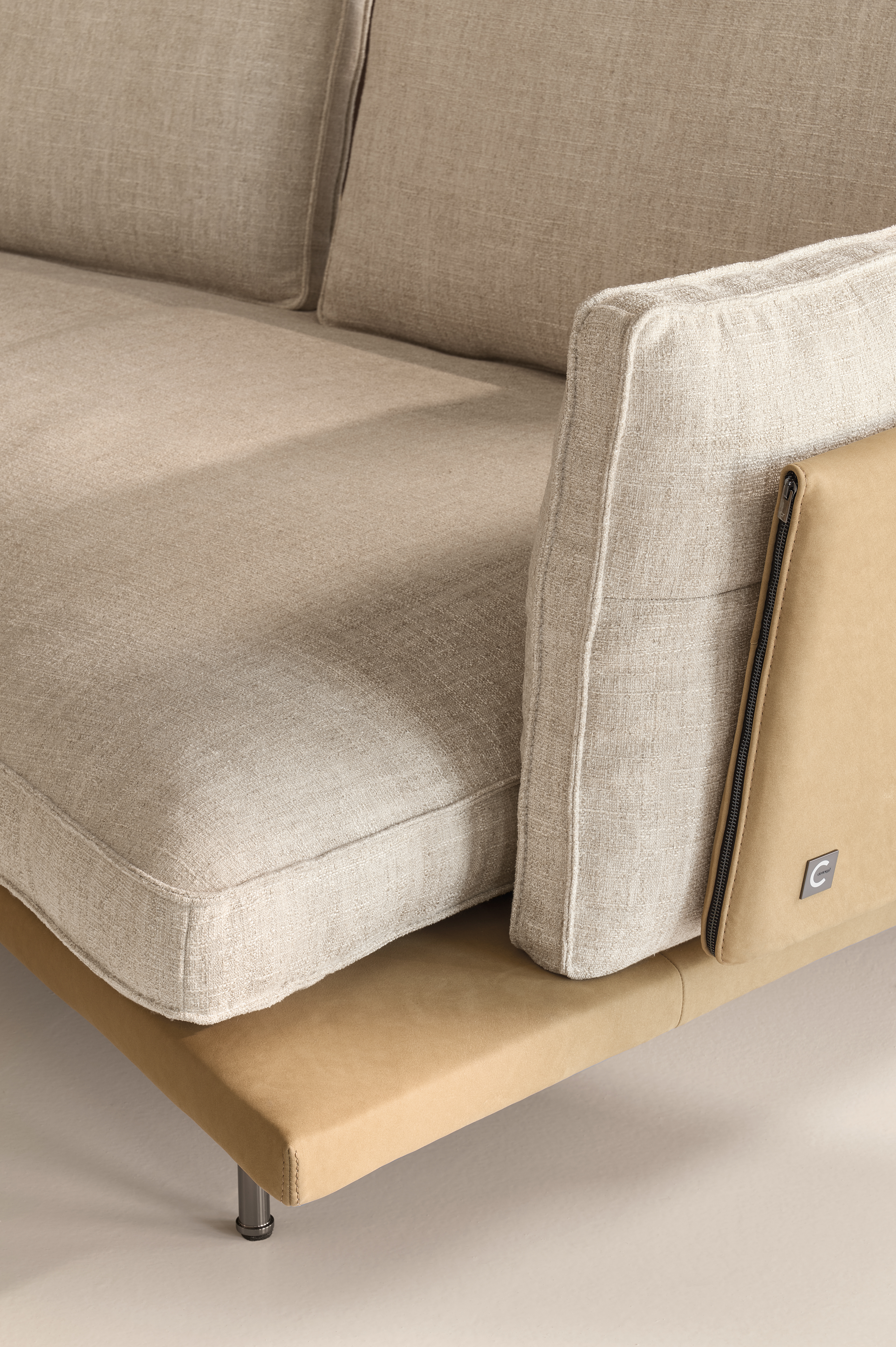 The black chrome metal plate on the armrest perfectly matches with other details with the same finish, such as the mechanisms, the tailored zippers, and the thin legs that elevate the product. Ii dettaglio della placca in metallo cromata nera sul bracciolo si sposa con altri elementi dalla stessa finitura come i meccanismi, le zip personalizzate e i piedi, i quali sono sottili e leggeri per dare slancio al prodotto.