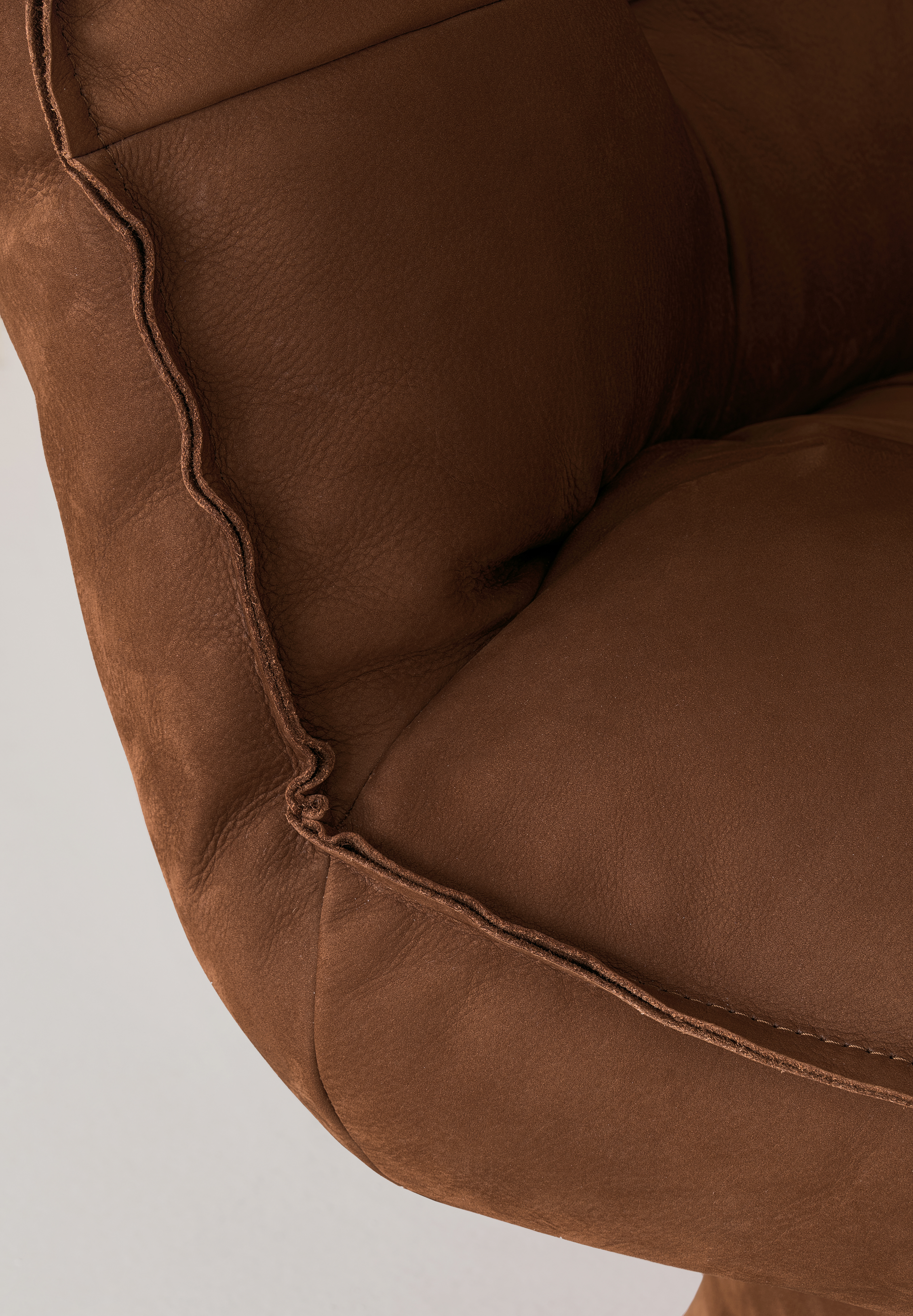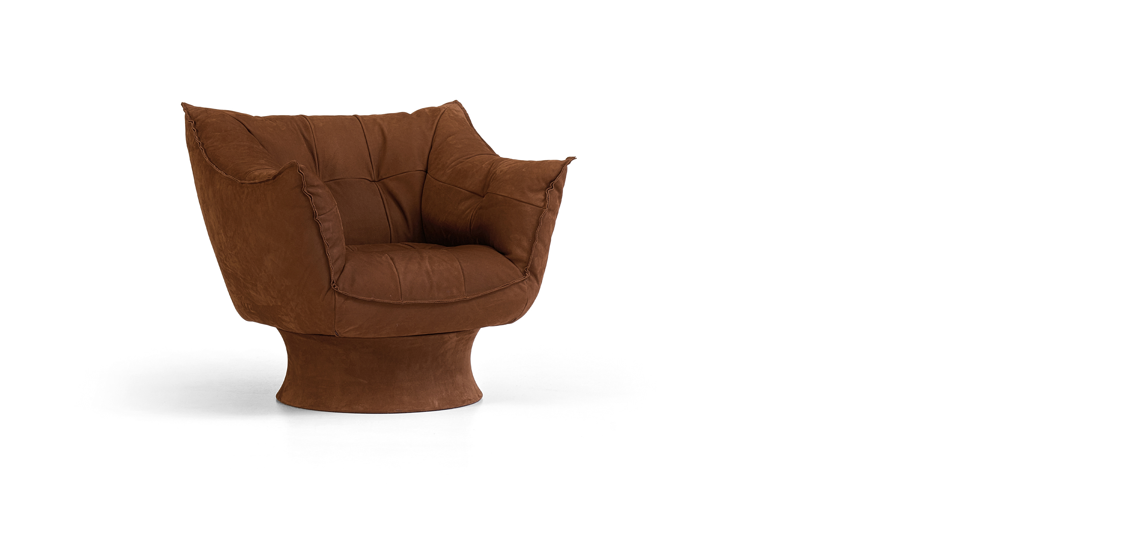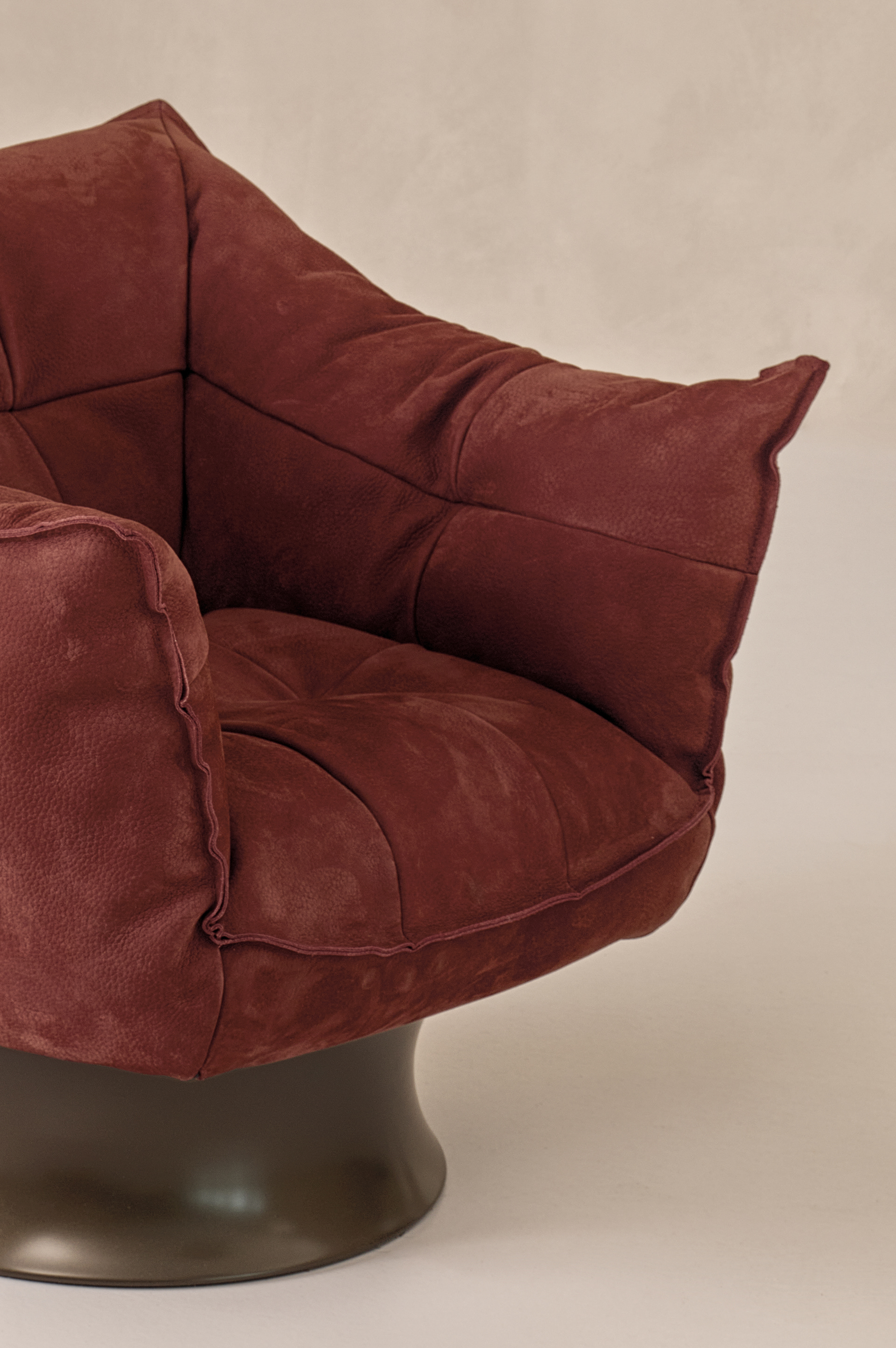 Armchair with metal frame and elastic bands support, upholstered with expanded polyurethane in differentiated densities, covered with a double layer of siliconized acrylic fiber. 360° swivel MDF base with return memory is either covered in leather Soffio, Setanil or Natural Velour, or lacquered metallic bronze. Poltrona con fusto in metallo e supporto di nastri elastici, rivestito con poliuretano espanso a densità differenziata, ricoperto da un doppio strato di fibra acrilica siliconata. Il basamento girevole a 360° con memoria di ritorno in MDF è rivestito in pelle a scelta tra Soffio, Setanil e Natural Velour, oppure laccato colore bronzo metallizzato.