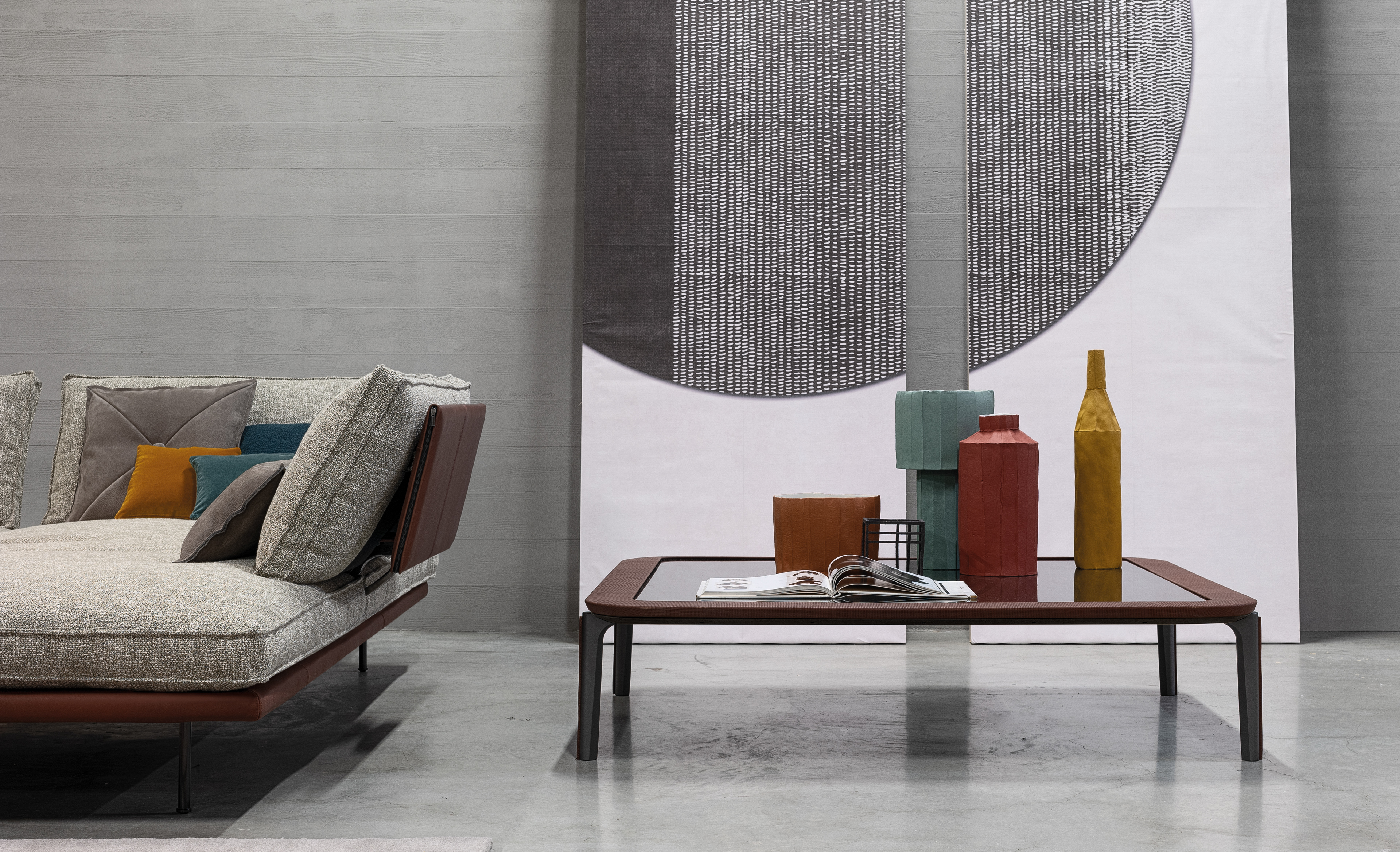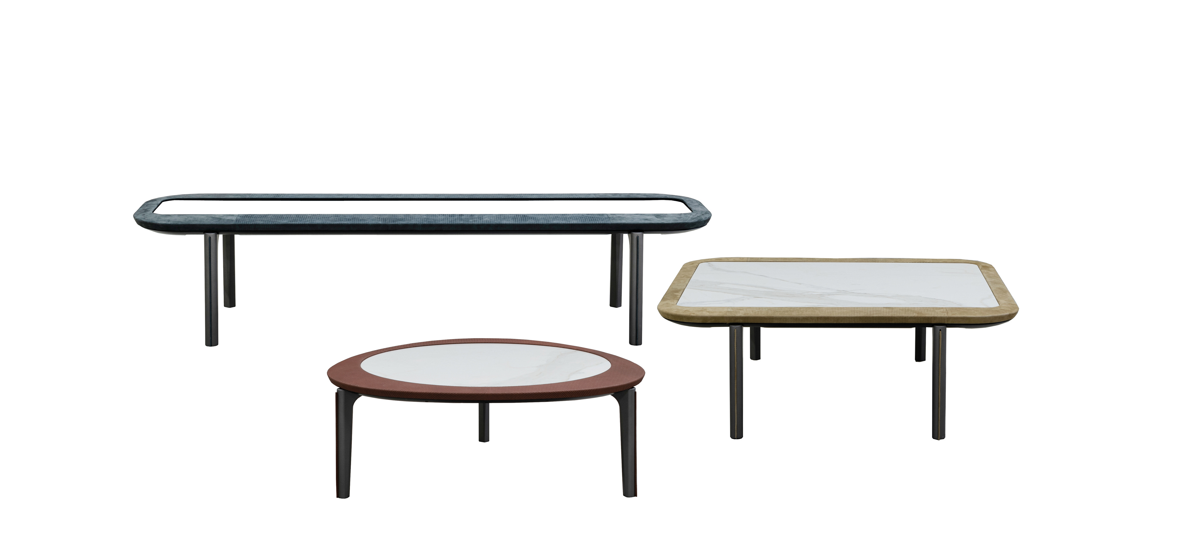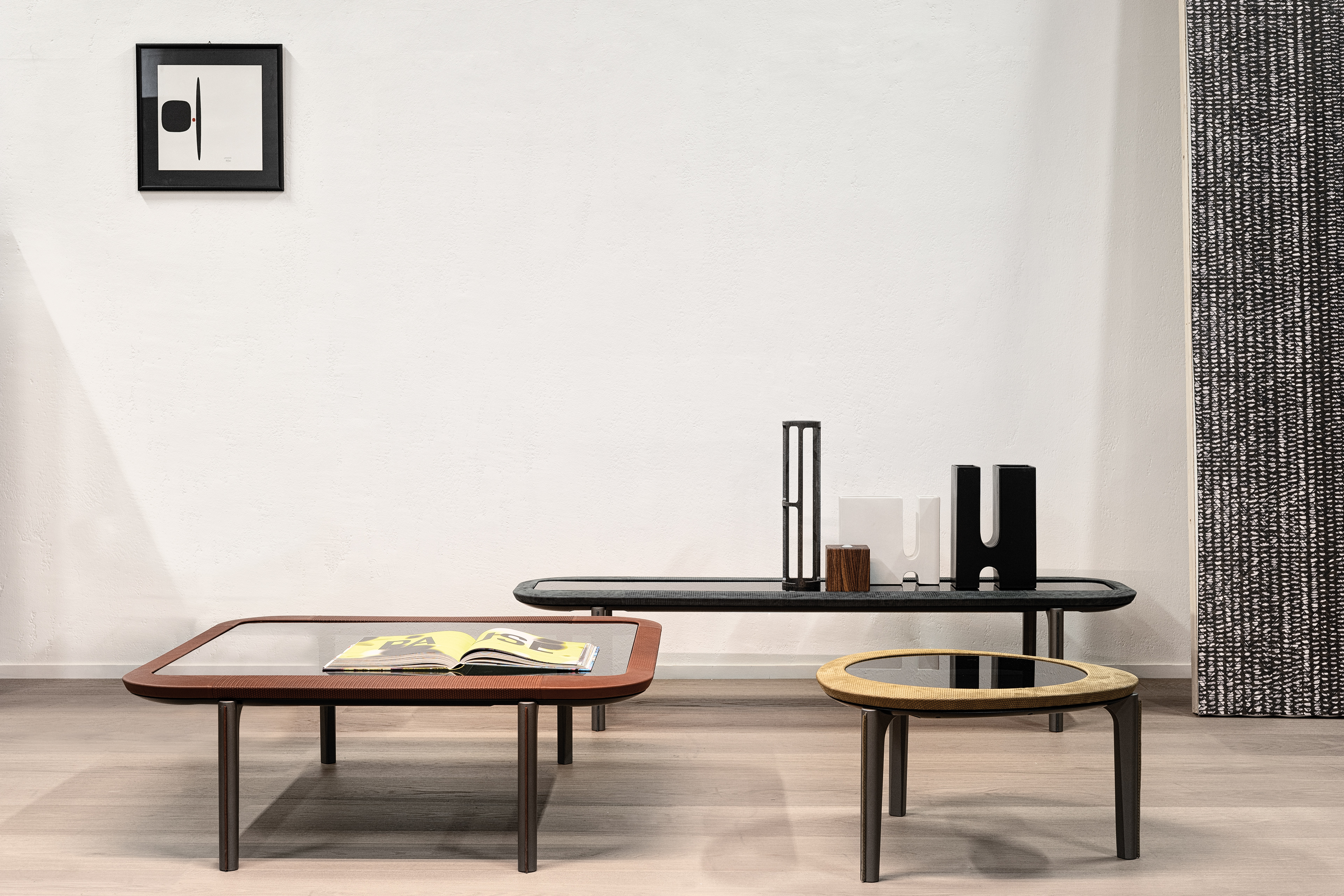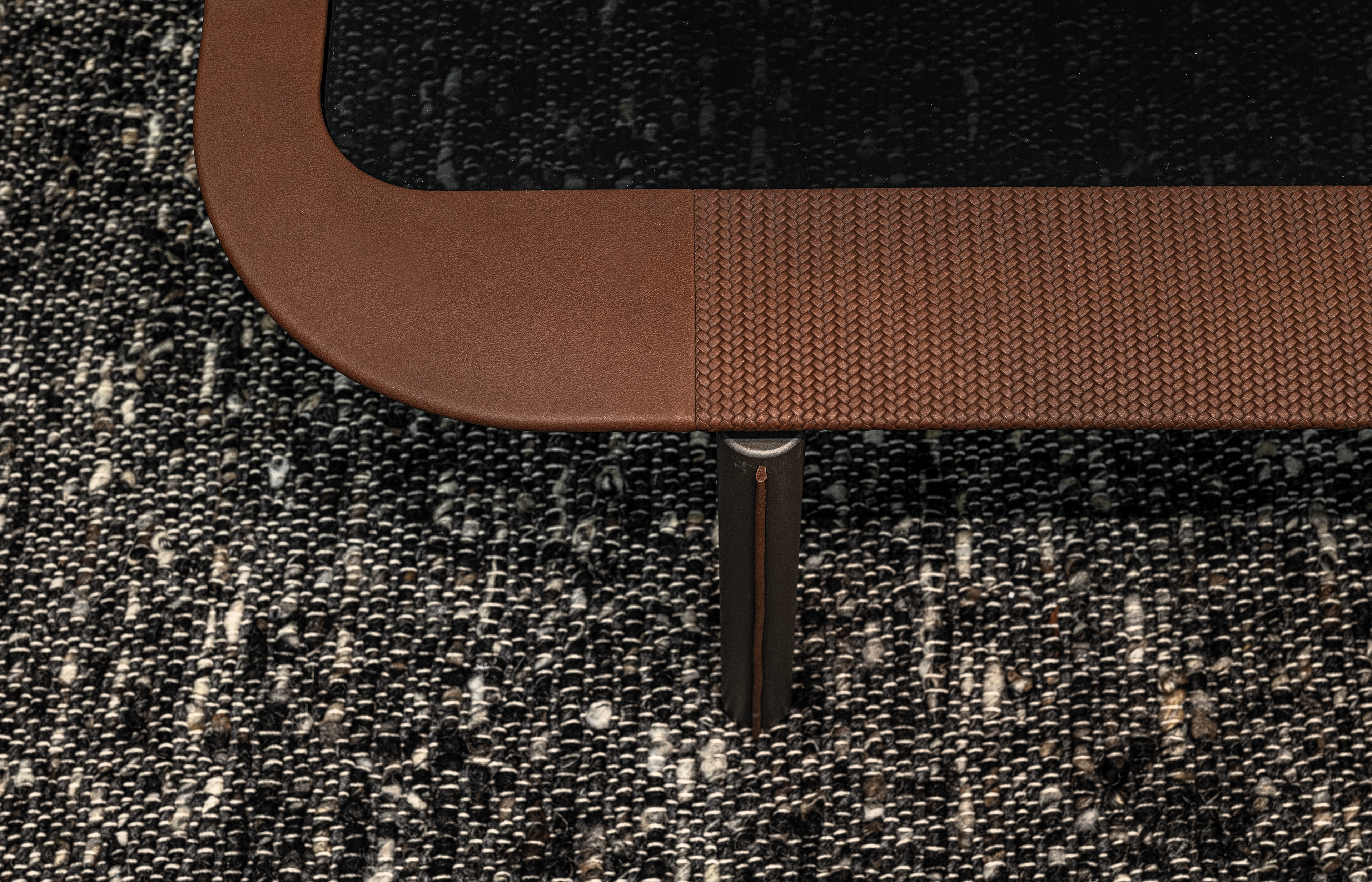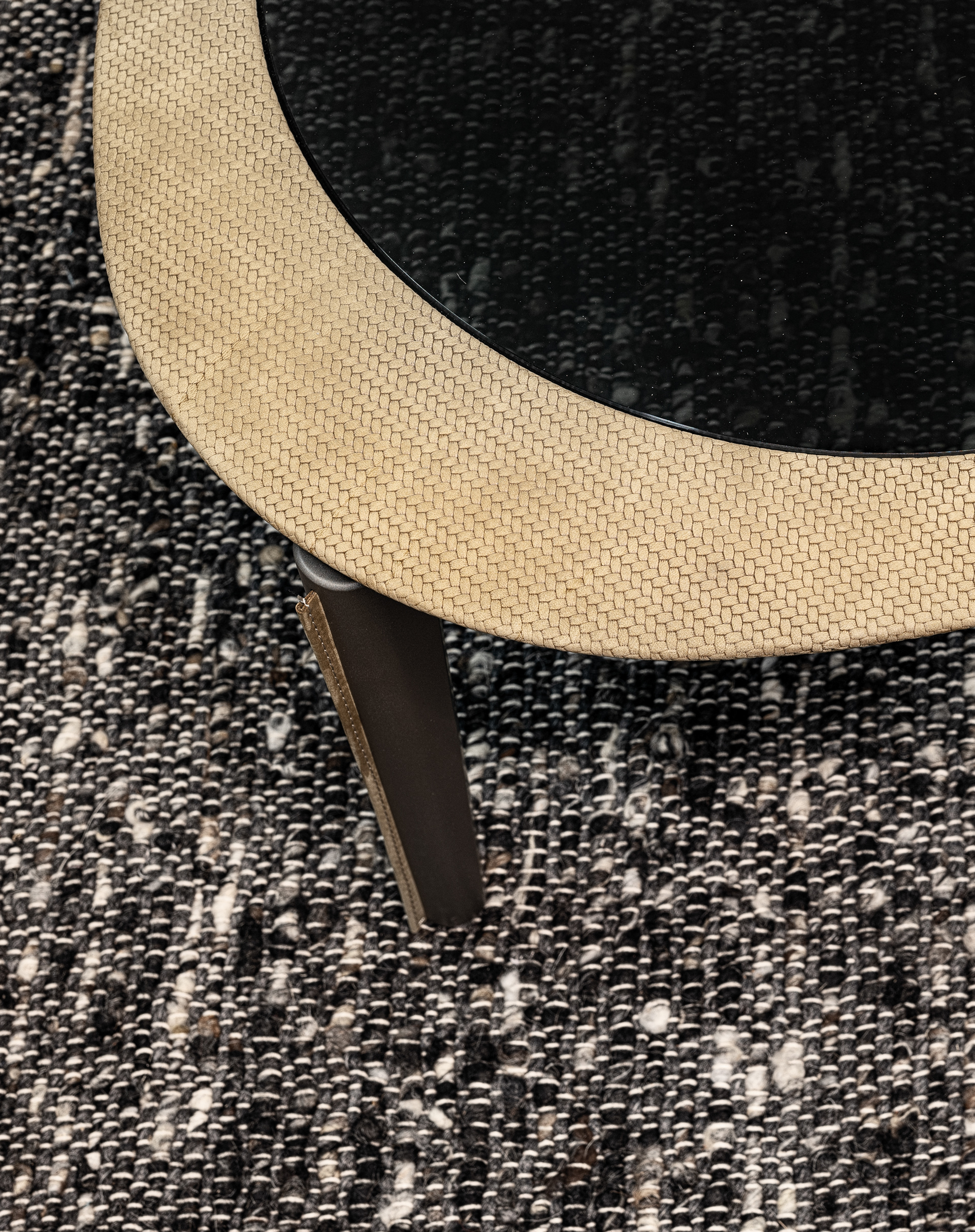 Glass-ceramic top surrounded by a printed leather frame. No corners for this table with a round design. Thin legs in varnished wood with a leather piping set in them. An extremely light and versatile look that can combine different materials. Senza spigoli. Piano in vetro ceramica circondato da una cornice in pelle stampata. Niente spigoli per questo tavolino dal design arrotondato. Piedini sottili in legno verniciato con il piping in pelle incastonato al suo interno. Una linea decisamente leggera e versatile capace di unire materiali diversi e complementari.