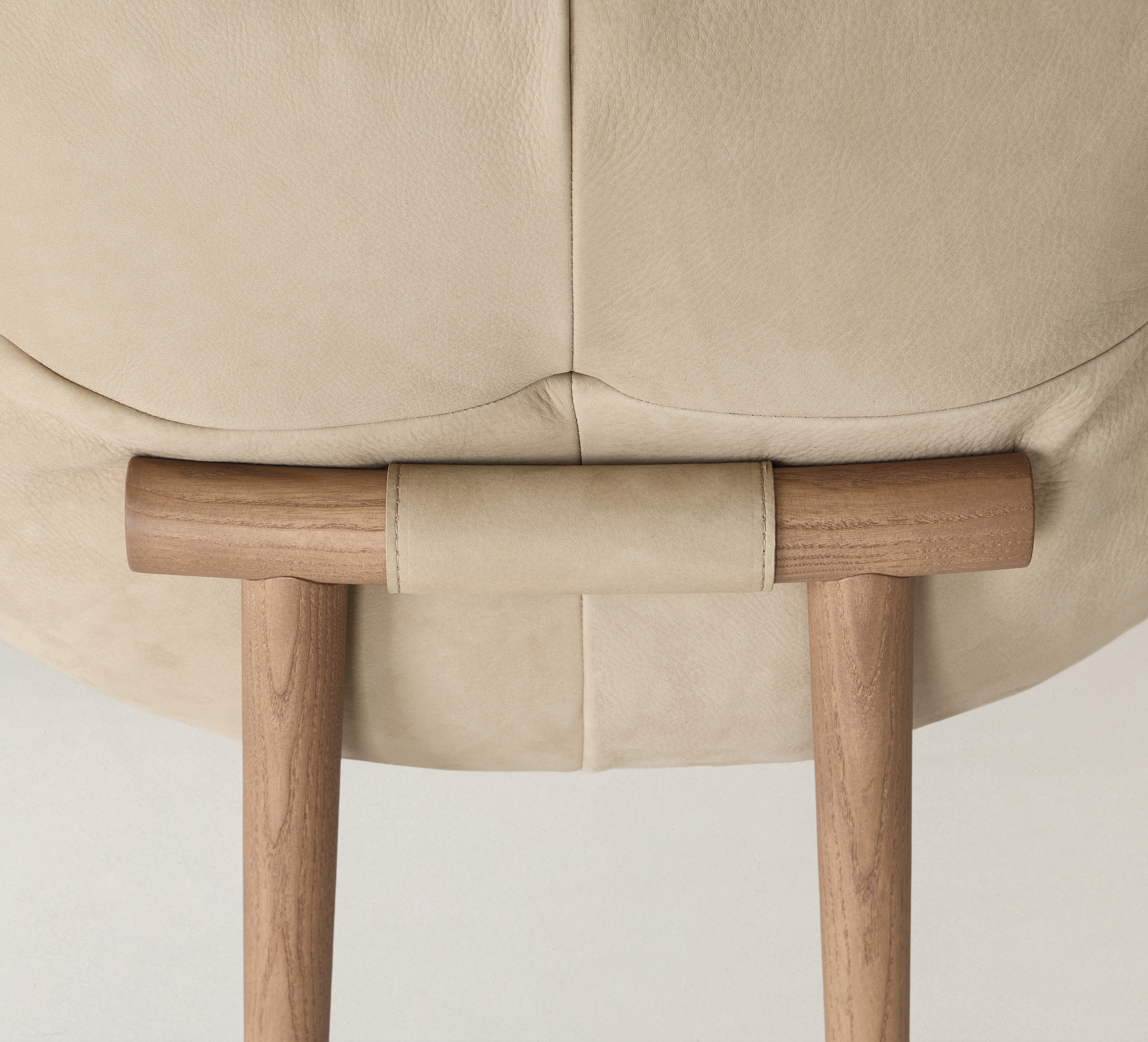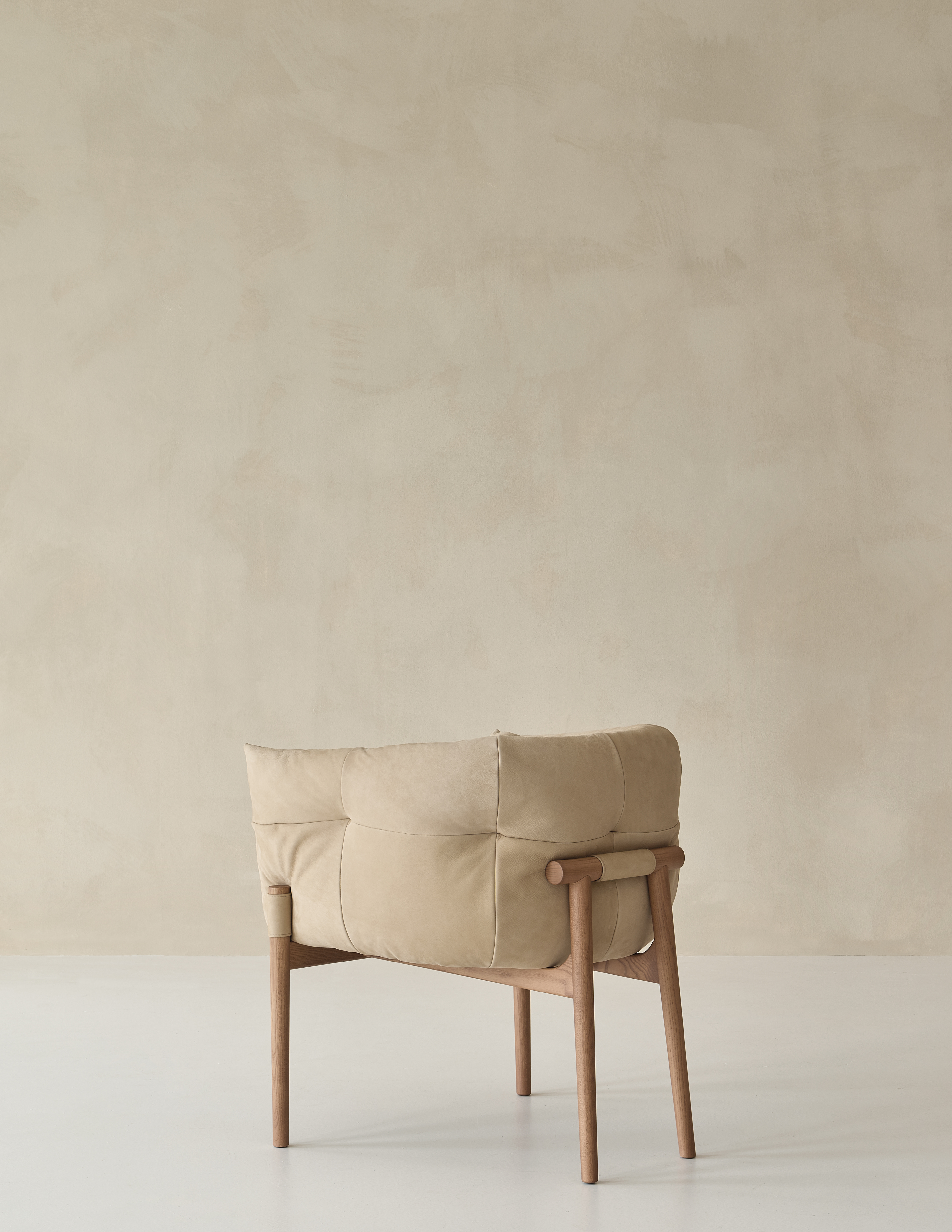 Chair with metal backrest structure upholstered with expanded polyurethane with differentiated density, covered with a double layer of siliconized acrylic fiber. The plywood seat is upholstered with expanded polyurethane and covered with siliconized acrylic fiber. The base is solid ash wood available in two colors: black or natural tint. The leather details are made with a special lacquered raw-cut finish, available in three leathers: Soffio, Setanil and Natural Velour. If no preference is specified, the edges feature tone-on-tone lacquering. Sedia con struttura schienale in metallo rivestito in poliuretano espanso a densità differenziata, ricoperto da un doppio strato di fibra acrilica siliconata. La seduta è in legno multistrato ricoperto da poliuretano espanso e rivestito in fibra acrilica siliconata. Il basamento è in legno massello frassino disponibile in 2 varianti di colore: nero o tinta naturale. Dettagli in pelle realizzata con una speciale finitura cuoio, disponibile in tre tipologie: Soffio, Setanil e Natural Velour. I bordi sono verniciati tono su tono se non viene specificata nessuna preferenza.