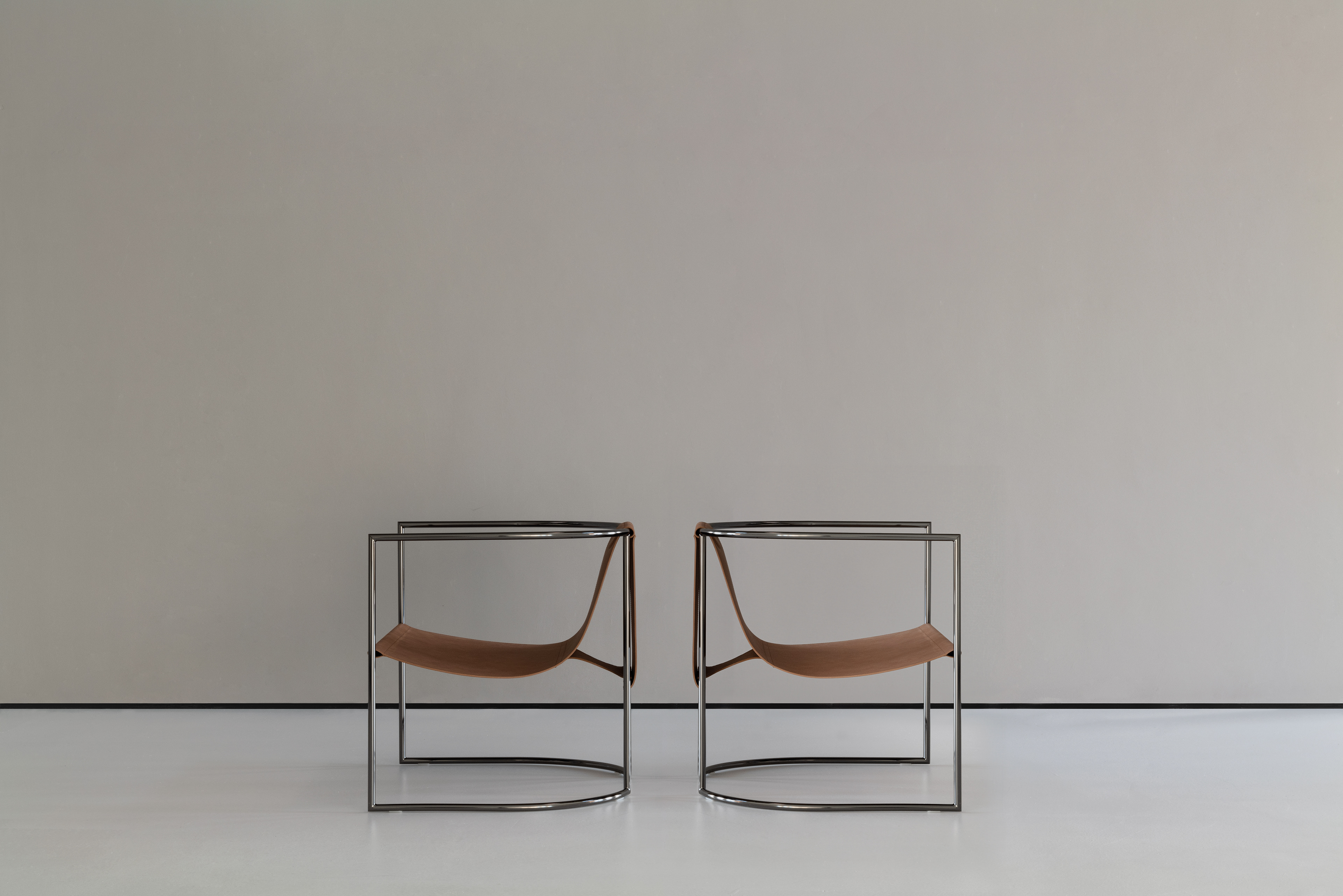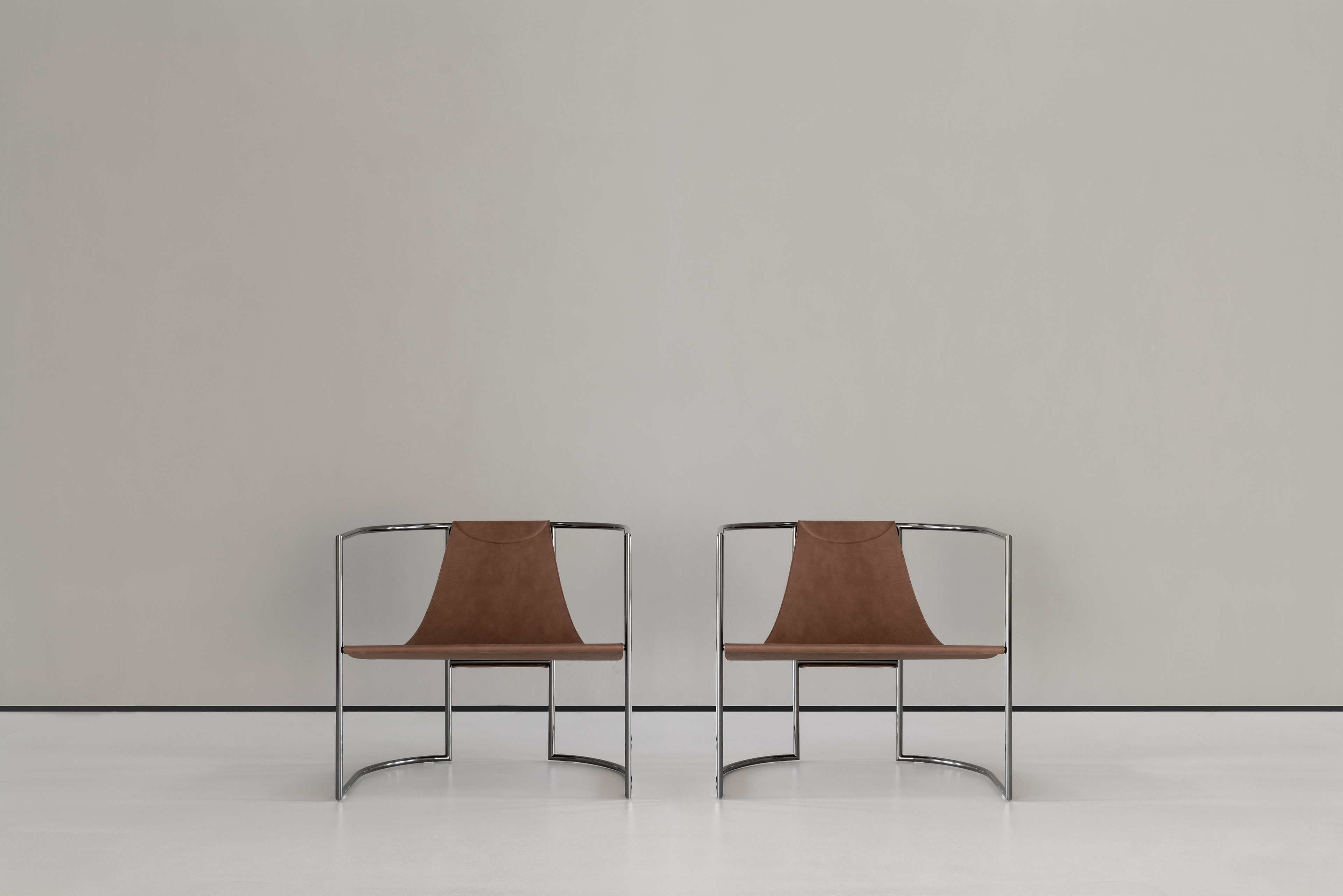armchair with metal structure, available in two finishes: painted chrome effect and painted black chrome effect. Seat covered in leather with special raw cut edges finishing, available in: Soffio, Setanil and Natural Velour. If no preference is specified, the edges feature tone-on-tone lacquering. poltrona con struttura in metallo, disponibile in due diverse finiture: verniciato effetto cromo e verniciato effetto cromo nero. Seduta in pelle realizzata con una speciale finitura cuoio, disponibile in tre tipologie di pelle: Soffio, Setanil e Natural Velour. I bordi sono verniciati tono su tono se non viene specificata nessuna preferenza.