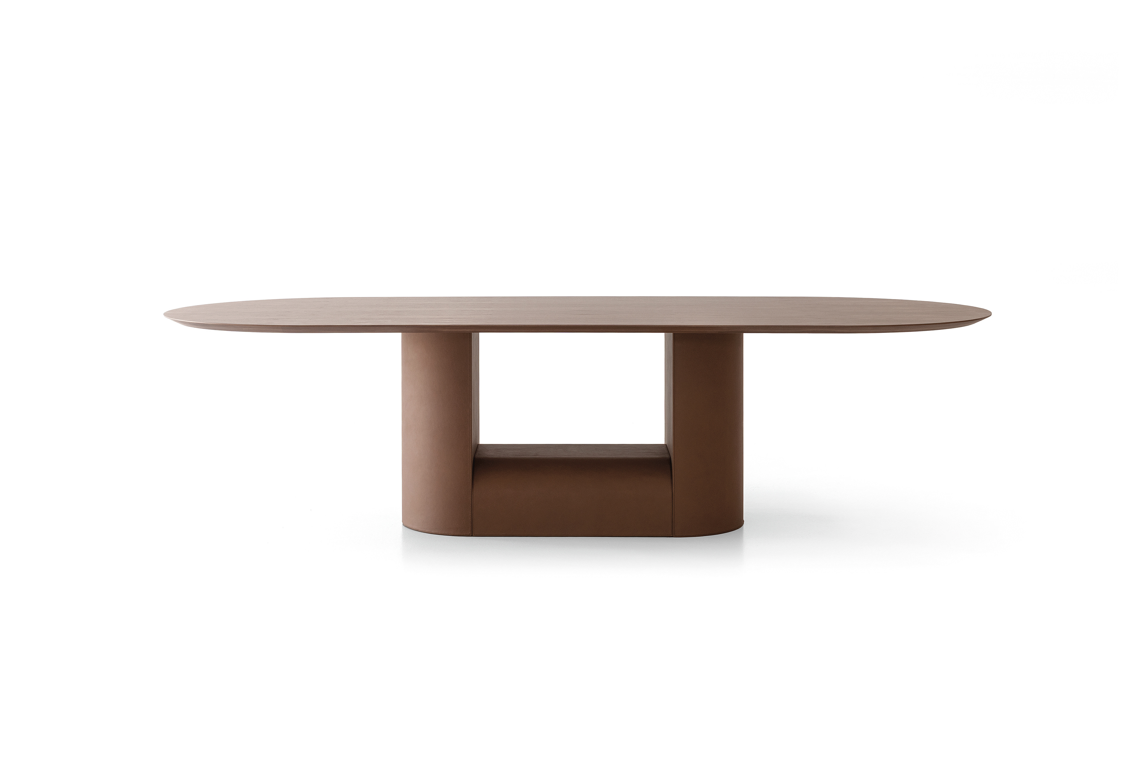 Inspired by the principles of purist art and architecture, the Samoa table presents itself as a true piece of micro-architecture. The design is defined by essential lines, clean volumes, and the absence of superfluous decoration. Pure forms and soft curves create shadow play that gently traces the leather-clad surfaces of the base. The top, crafted in wood or stone-effect ceramic, introduces a tactile quality that contrasts with the minimal elegance of the forms, creating a harmonious dialogue between material and volume. Ispirato ai principi dell’arte e dell’architettura purista, il tavolo Samoa si presenta come una vera e propria micro architettura. Il progetto si caratterizza per linee essenziali, volumi definiti e l’assenza di decorazioni superflue. Le forme pure e le curve morbide generano giochi di ombre che disegnano delicatamente le superfici in cuoio della base. Il top, realizzato in legno o ceramica effetto pietra, aggiunge una qualità tattile che contrasta con l’eleganza minimale delle forme, creando un dialogo armonioso tra materia e volume.