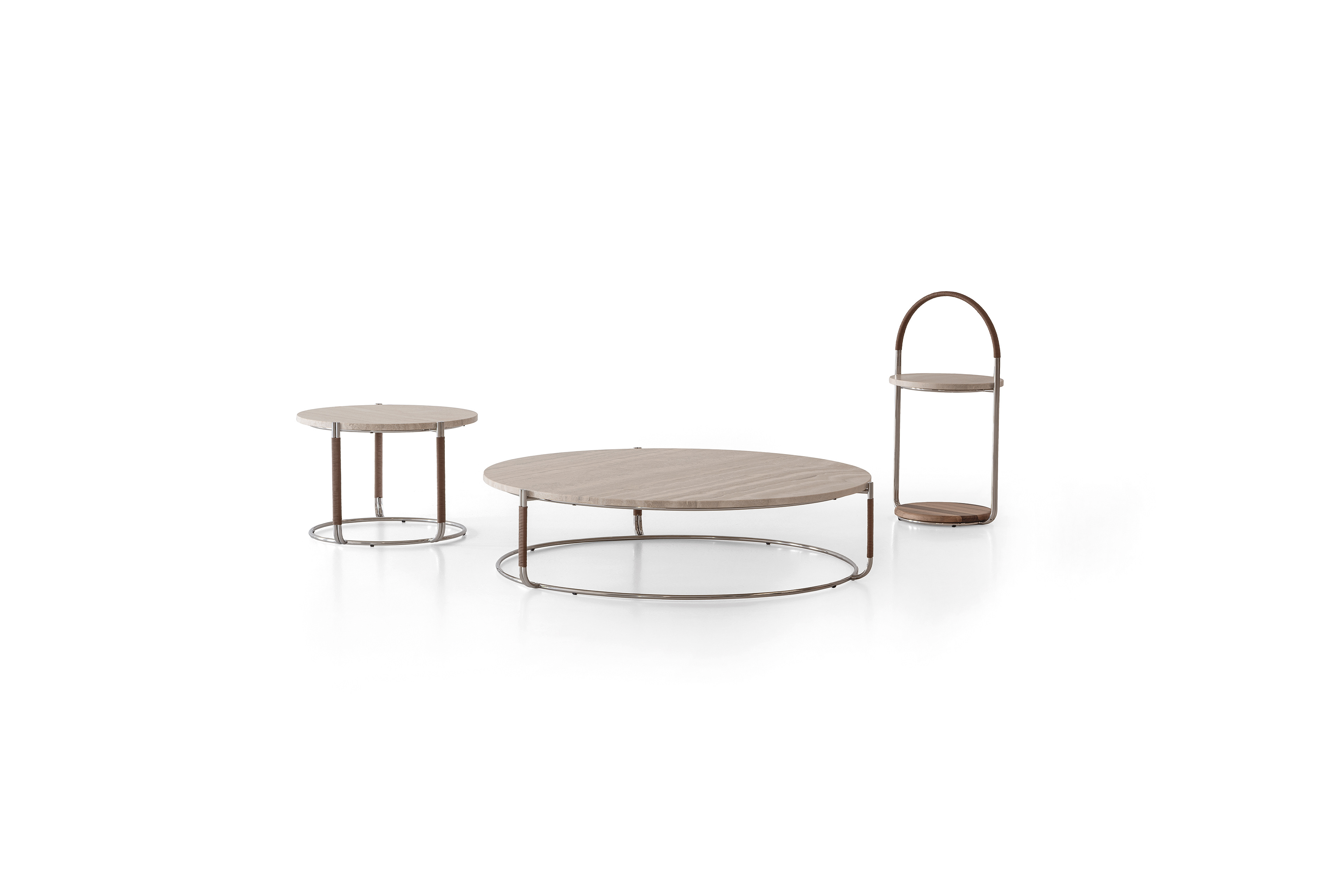 Two parallel tubular elements form a figure “8”, the defining symbol and namesake of the collection. The thin, lightweight metal lines sketch out slender structures in space, joined together by a leather cord that is meticulously hand-wrapped. In contrast to the lightness of the supporting frame, tops in stone or wood complete the piece. Due tubolari affiancati formano un “8”, segno distintivo e nome della collezione. Le linee sottili e leggere del metallo disegnano nello spazio esili strutture unite tra loro tramite una corda in cuoio che viene avvolta manualmente. In contrasto alla leggerezza della struttura portante piani in pietra o legno completano il prodotto.