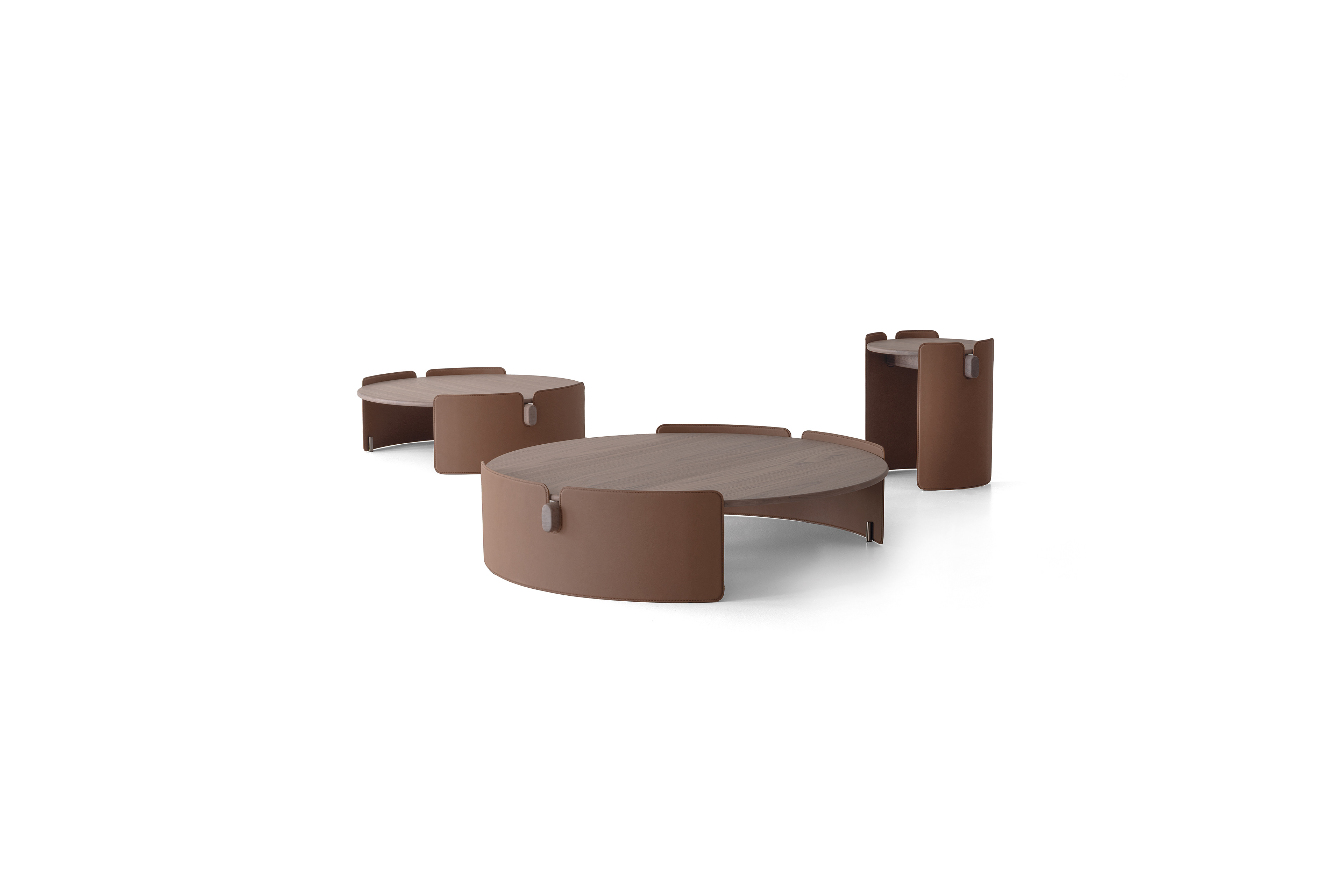 With its essential and primordial appearance, the Maori coffee table series stands out for a bold joint that connects its structural elements. Like a mask resting on a face, two leather surfaces wrap around and support the circular top in wood or stone, while a solid wood crosspiece firmly locks and holds all the components together. The result is an object that evokes the strength and purity of primitive forms, while also enhancing the intrinsic value of each material. Dall’aspetto essenziale e primordiale, la serie di tavolini Maori si distingue per un macro-incastro che unisce gli elementi costitutivi. Come una maschera che si posa sul volto, due superfici in cuoio avvolgono e sorreggono il piano circolare in legno o pietra, mentre un traverso in legno massello tiene saldamente insieme e incastra tutti i componenti. Il risultato è un oggetto che richiama la forza e la purezza delle forme primitive, esaltando al contempo il valore intrinseco di ciascun materiale.