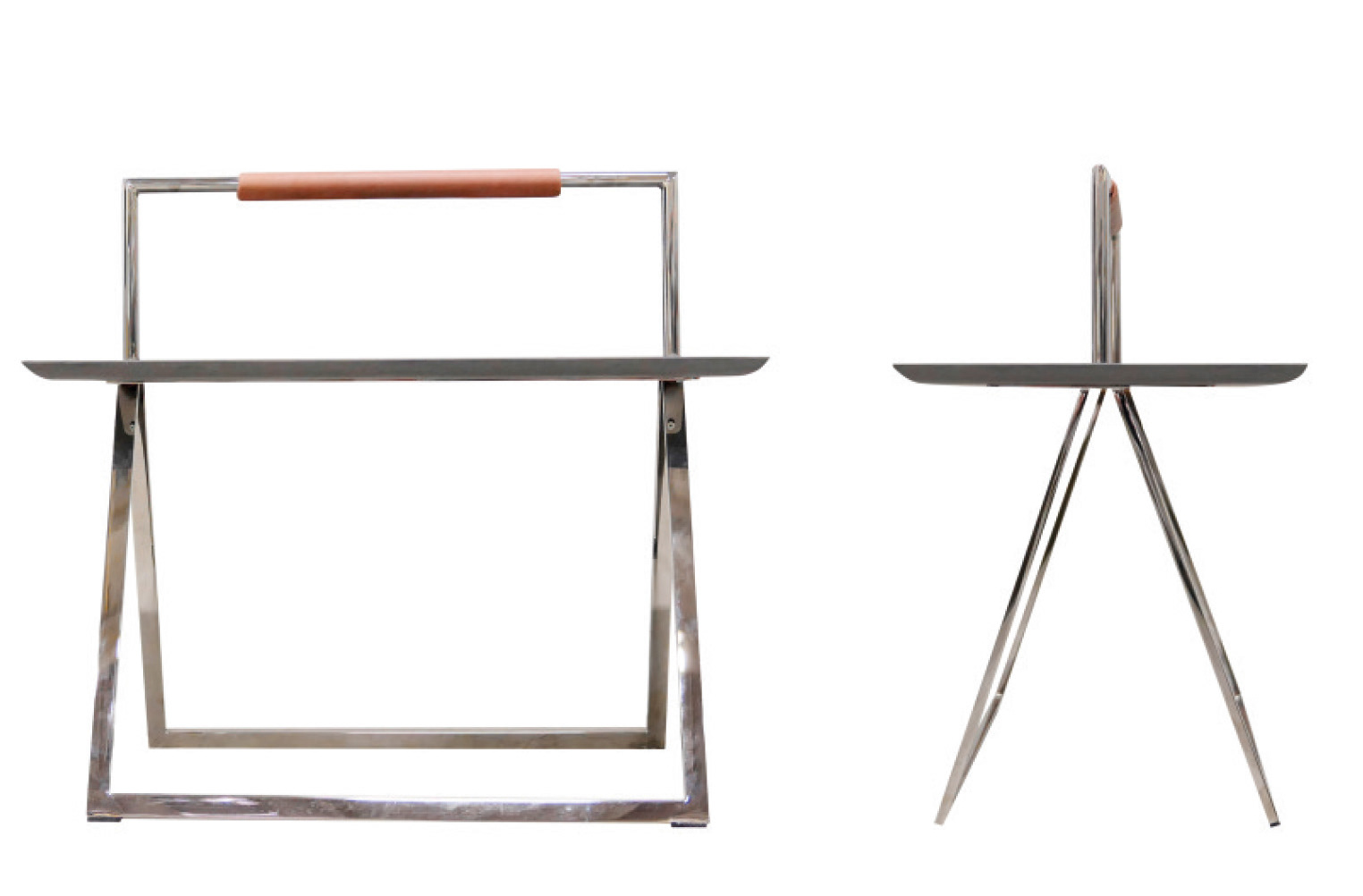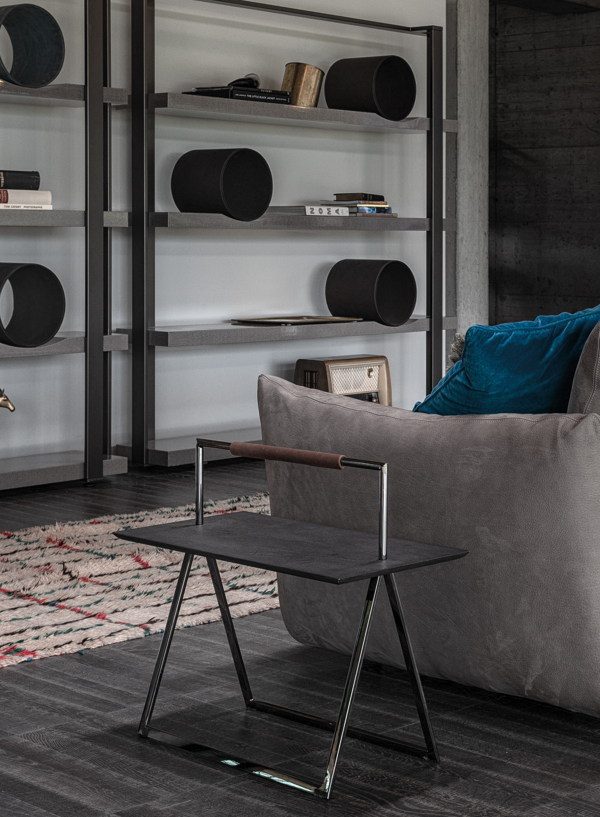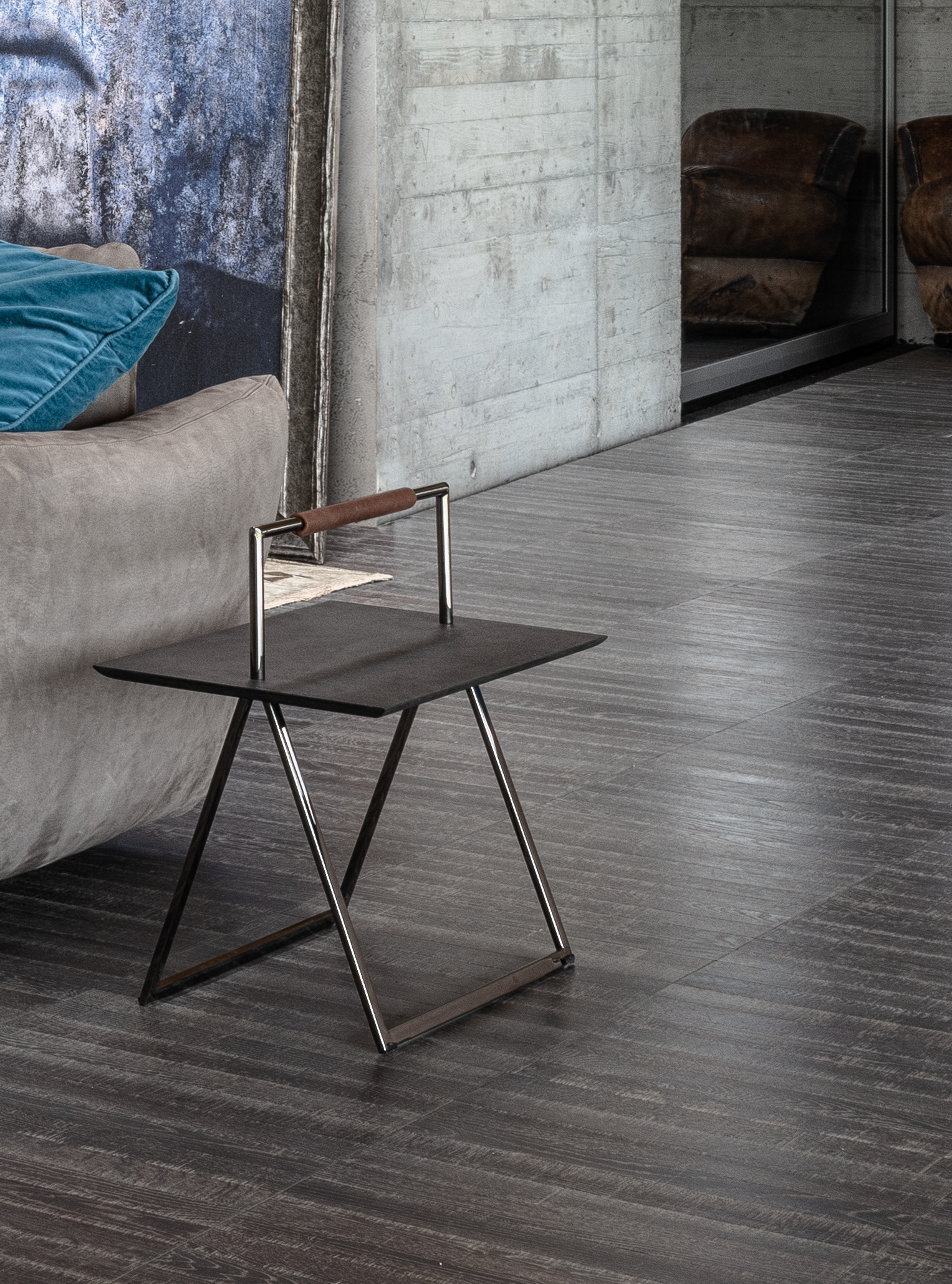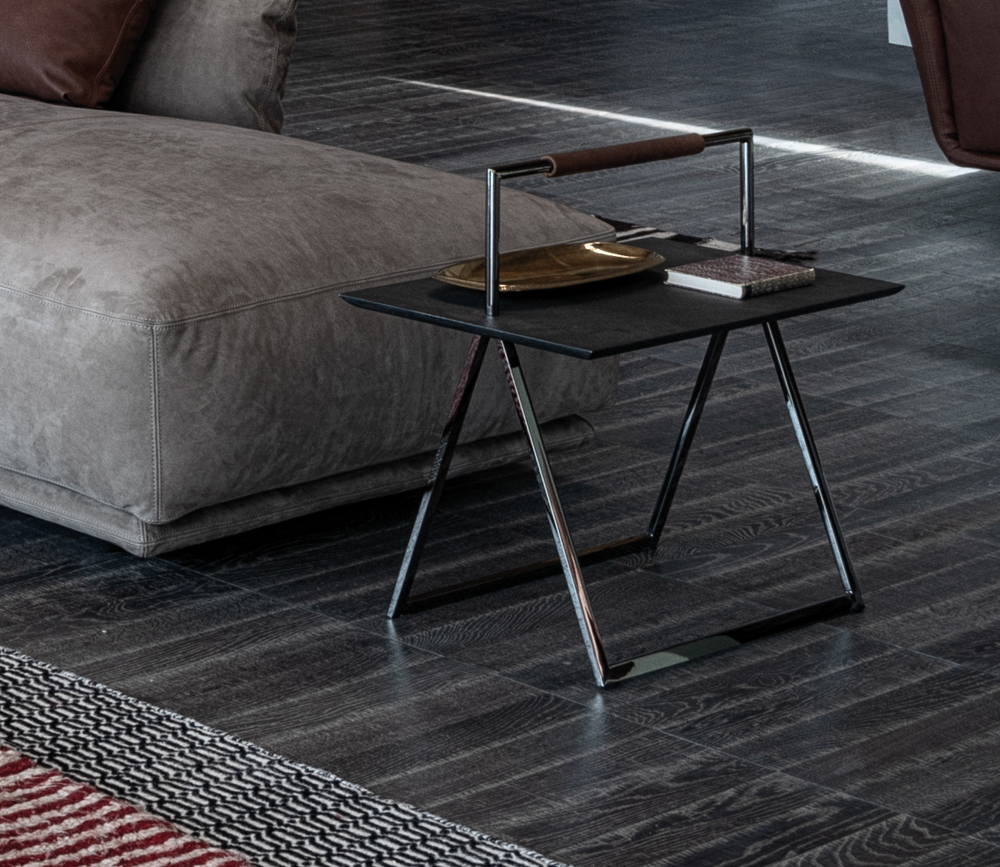 Nadir is at the service of your comfort. You can easily lift it and move it, thanks to the metal structure and the handle covered in leather. Minimal yet elegant, it fits every space and situation. Leggiadro e svolazzante. Nadir è il tavolino a servizio della comodità. Si prende e si sposta con semplicità grazie alla sua struttura in metallo e al manico rivestito in pelle. Discreto ed elegante, è un invito alla versatilità.