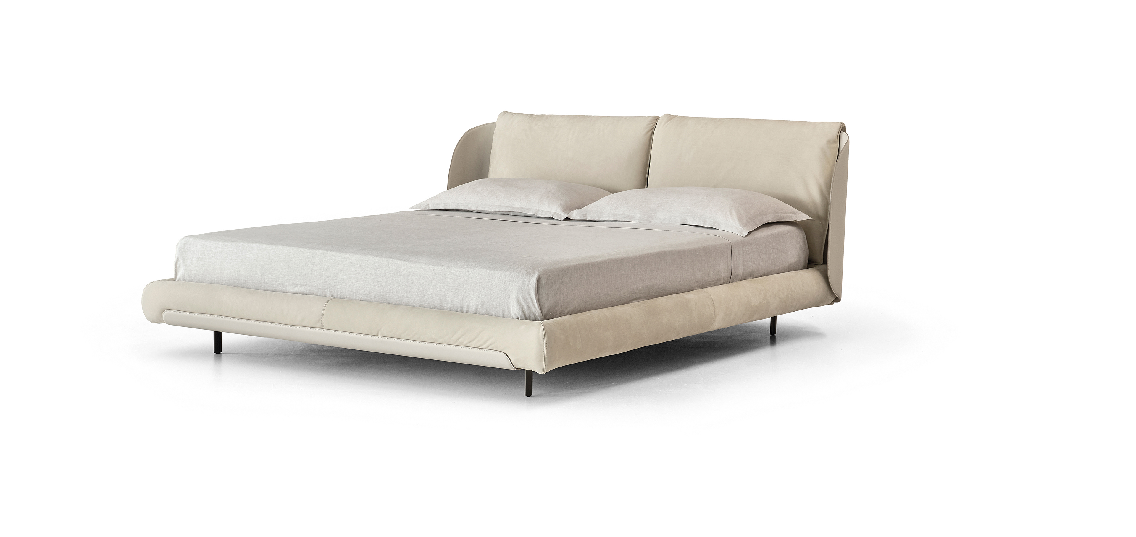 Bed with metal headboard upholstered in expanded polyurethane, covered with an acrylic layer. The curved metal sides of the headboard are covered in leather with a special lacquered raw-cut finish, available in three leathers: Soffio, Setanil and Natural Velour. The wooden sommier is upholstered with expanded polyurethane, covered with an acrylic layer. Upon request, on the footboard it is possible to add a curved metal bar covered in leather with a special lacquered raw-cut finish, available in three leathers: Soffio, Setanil and Natural Velour. The metal feet are only available in metallic bronze. Mattress is not included. Letto con testiera in metallo imbottita con poliuretano espanso rivestito con falda acrilica. Elementi laterali in metallo incurvato rivestito in pelle realizzata con una speciale finitura cuoio, disponibile in tre tipologie: Soffio, Setanil e Natural Velour. Il sommier è realizzato in legno imbottito con poliuretano espanso, rivestito in falda acrilica. Nella pediera, su richiesta, è possibile montare una barra in metallo incurvato rivestita in pelle realizzata con una speciale finitura cuoio, disponibile in tre tipologie: Soffio, Setanil e Natural Velour. I piedi sono in metallo disponibili in una finitura: bronzo metallizzato. Il materasso non è incluso.