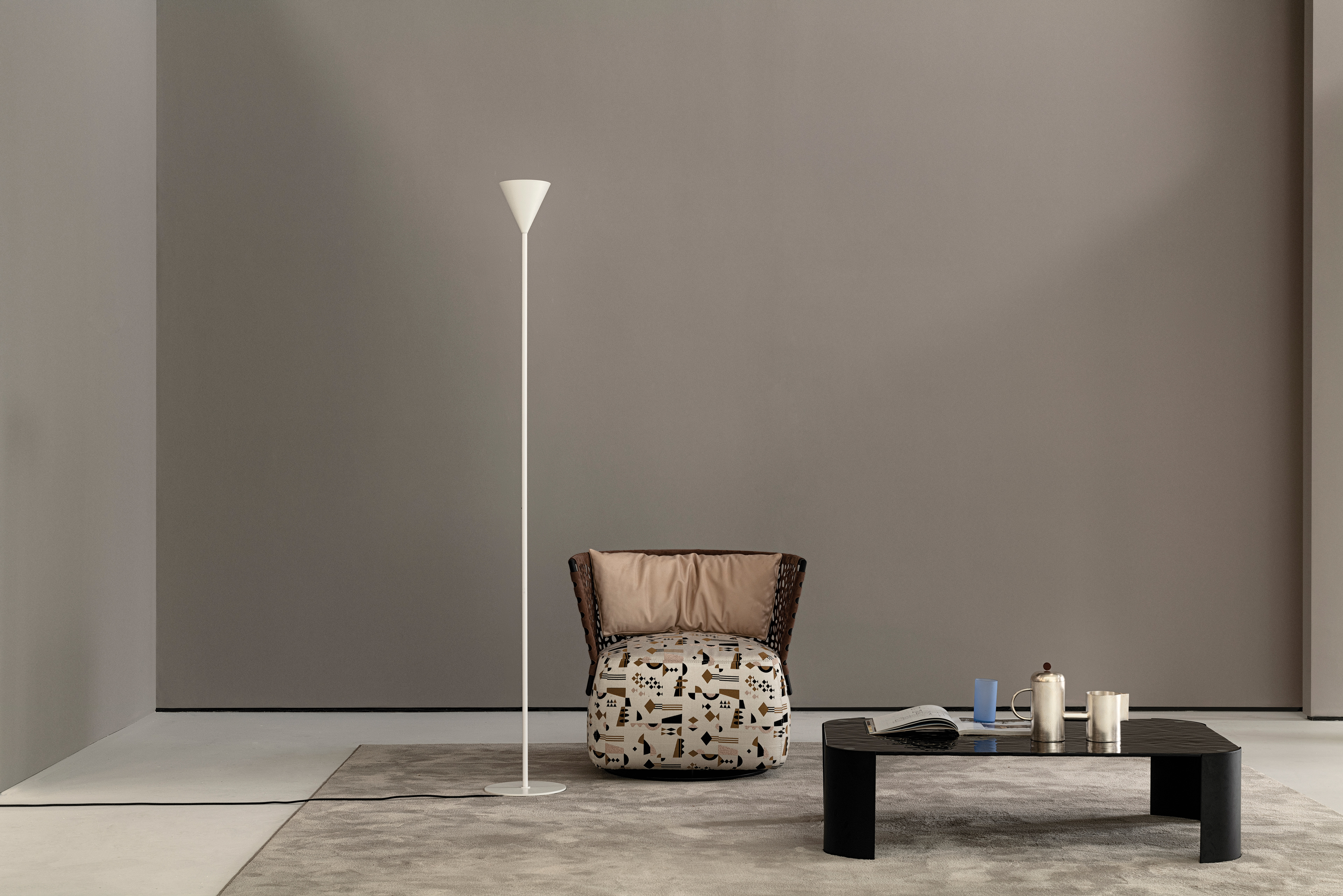 If your house were a kingdom, it would certainly have its exotic queen, a black pearl of bewitching beauty. Regis would be her throne, with its simple cylindrical frame that stretches upwards, and the fine engraving in the leather seat-back: imagery that suggests lush plants and the tracks of wild foxes. Se la casa fosse un regno metropolitano, avrebbe di certo la sua regina esotica, una perla nera di ammaliante bellezza. Regis è il suo piccolo trono, essenziale nello sviluppo cilindrico che si protende verso l’alto, e poi prezioso nell’intaglio dello schienale di cuoio, un’immagine che evoca piante rigogliose e orme di volpi selvatiche.