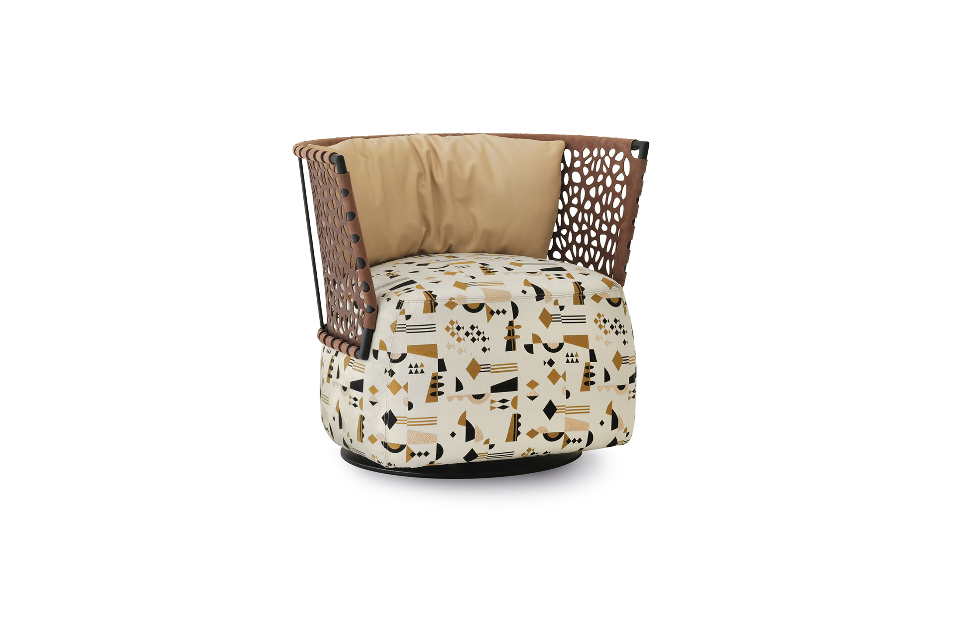 Armchair seat structure in metal with support of elastic bands, covered in polyurethane foam covered with silicone microfibre and acrylic pad. The backrest upholstery is available only in carved Cuoio. The armchair is equipped with a 360° swivel mechanism with return memory. The siliconized microfibre lumbar support is included in the model. Back structure in matt painted metal tubing, available in ten RAL colors: 9005-5020-6026-3003-9002-7030-7024-3007-6008 and NCS: 2010Y70R 4. Poltroncina con struttura del sedile in metallo con supporto di nastri elastici, rivestita in poliuretano espanso ricoperto con microfibra siliconata e falda acrilica. Il rivestimento dello schienale è disponibile sono in cuoio intagliato. La poltrona è dotata di meccanismo girevole a 360° con memoria di ritorno. Il poggiareni in microfibra siliconata è incluso nel modello. Struttura schienale in tubolare metallico verniciato opaco, disponibile in dieci colori RAL: 9005-5020-6026-3003-9002-7030-7024-3007-6008 e NCS: 2010Y70R 4.