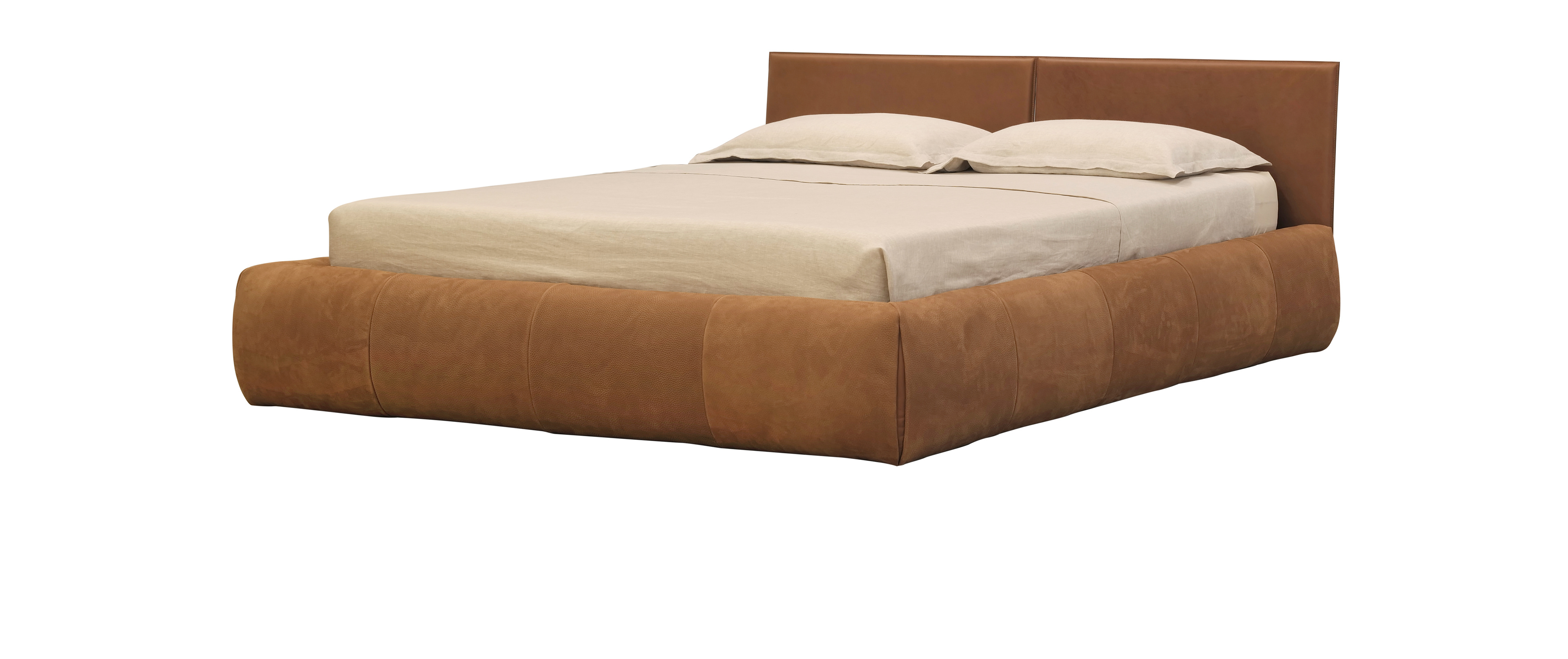 This bed is made of a metal headboard that is filled with expanded polyurethane foam and finished with special raw cut edges sewing which can only be made in leather Setanil or Soffio. The frame is made of polyurethane-filled wood covered with an acrylic fiber layer. Legs are made in black painted aluminum. Mattress is not included. Letto con testiera in metallo imbottita con poliuretano espanso e lavorazione speciale a taglio vivo disponibile solo nelle pelli Setanil e Soffio. Sommier in legno imbottito con poliuretano espanso rivestito con fibra acrilica. Piedi in alluminio verniciato nero. Il materasso non è incluso.