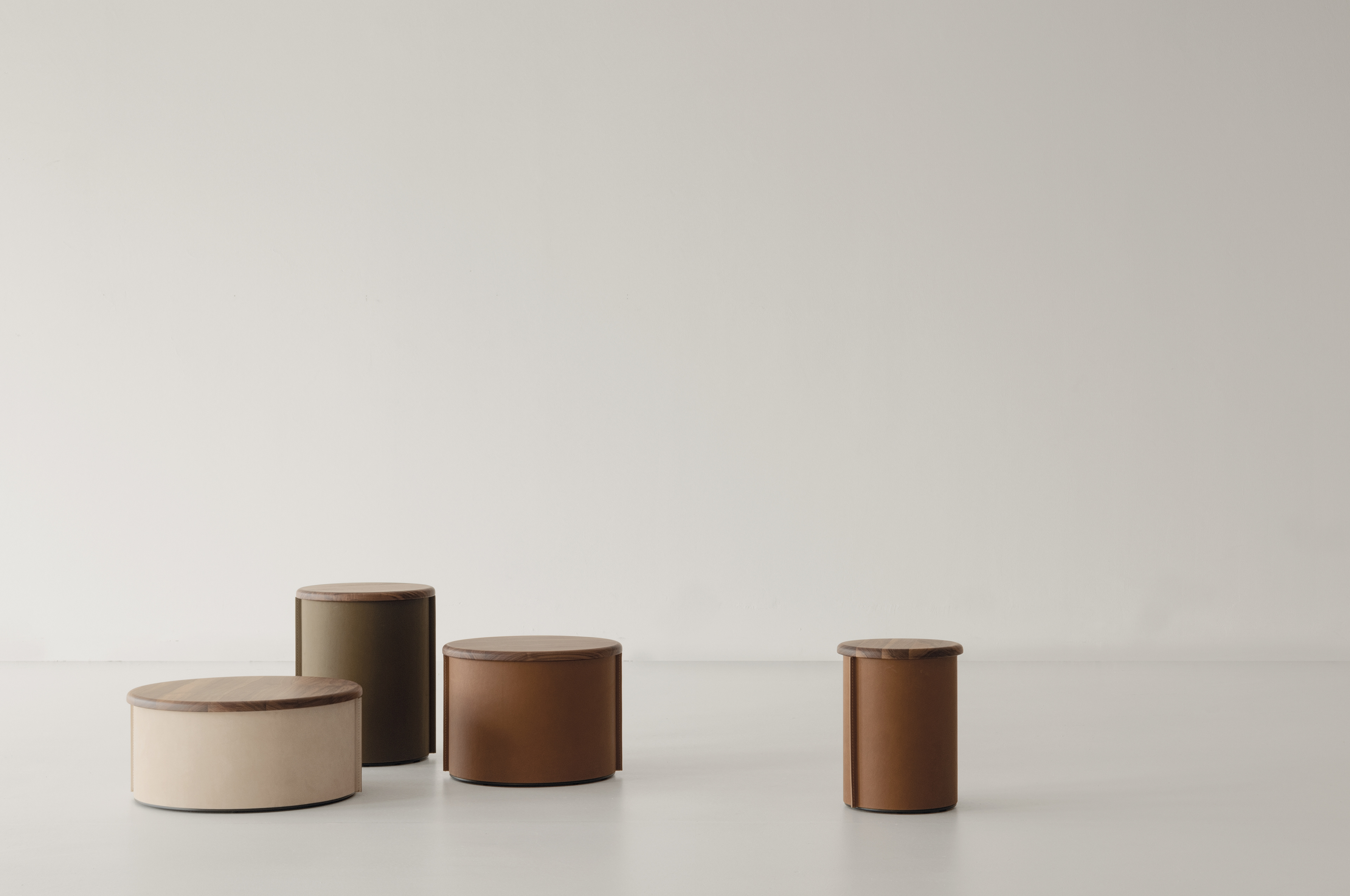 Tappo coffee tables with top in Travertine stone or solid Canaletto walnut wood. Wooden base painted black. Structure in high-wearing plastic covered in leather with special raw cut edges finishing, available in three different leathers: Soffio, Setanil and Natural Velour. If no preference is specified, the edges feature tone-on-tone lacquering. Tappo tavolini con top in Travertino o legno massello Noce Canaletto. Struttura base in legno verniciato nero. Struttura corpo polimero ad alta resistenza, rivestito in pelle con finitura cuoio disponibile in tre tipologie di pelle: Soffio, Setanil, Natural Velour. I bordi sono realizzati tono su tono se non viene specificata alcuna preferenza.